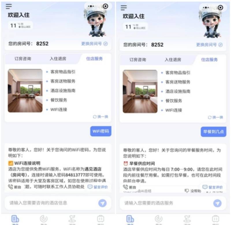 “黄小西酒店智能体”接入多种大模型,能够有效分流酒店日常重复性咨询,提升服务响应效率。其全流程数字化管理模式,为酒店业提升服务效率与住客体验等方面提供了技术支撑。如该智能体能自动响应住客关于Wi-Fi密码、早餐时间等常见问题,将员工从重复性事务中解放出来,使其能够更专注于提供个性化服务。