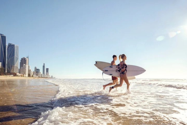 黄金海岸“冲浪天堂”的美誉,绝不是浪得虚名的,连绵几百公里的银白沙滩、时刻不歇的层叠海岸,让这里成为天然的冲浪胜地。