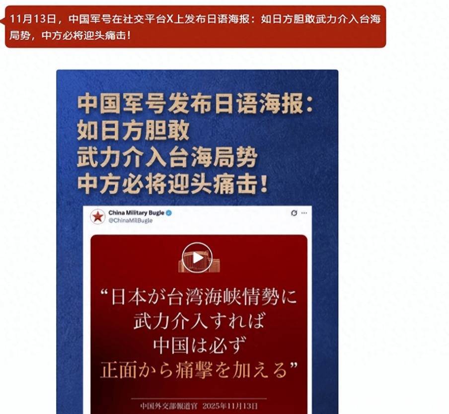 在日本拒绝修改其对台错误表述后,中方开始采取多线施压的策略。无论是外交颁布的警告、军事层面的表态,还是社会舆论的声势,都显示出北京方面的紧迫感。特别是在11月13日,中国人民解放军通过社交媒体发布了一张日语海报,内容直截了当,警告日本若干涉台海事务,必将迎头痛击。这种直接且清晰的传达方式显然是希望让日本决策层及民众意识到事态的严重性。
