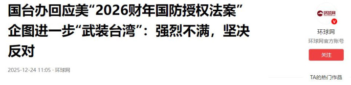 环球网:国台办回应美“2026财年国防授权法案”企图进一步“武装台湾”:强烈不满,坚决反对