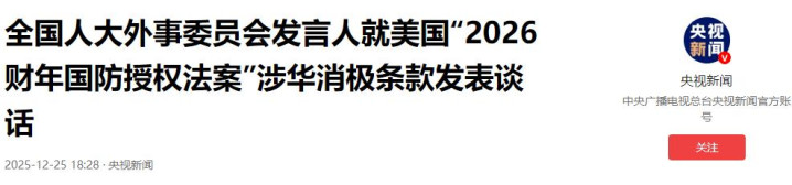 央视新闻:全国人大外事委员会发言人就美国“2026财年国防授权法案”涉华消极条款发表谈话